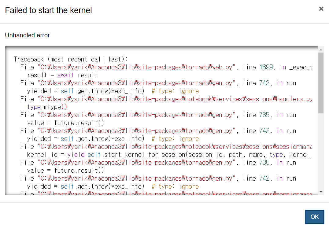 File "C:\Users\yarik\Anaconda3\lib\site-packages\notebook\services\sessions\sessionmanager.py", line 101, in start_kernel_for_session