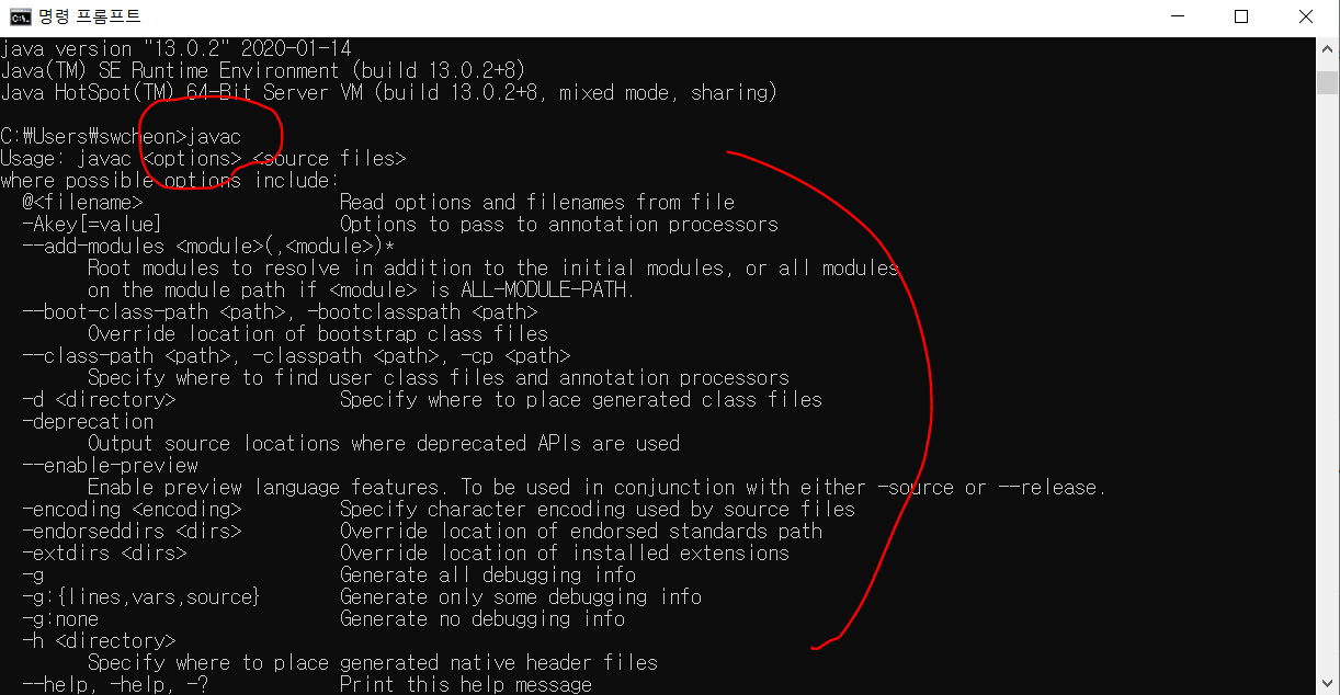 물론 나는 저 오류가 떴을때, javac라 치면 저렇게 나오지 않았다.